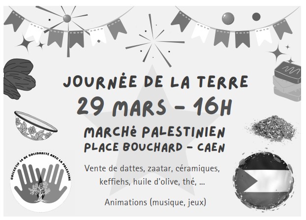 Le collectif 14 de solidarité avec la Palestine organise un rassemblement autour d’un marché palestinien le 29 mars, à 16 H, place Bouchard à Caen. Le 30 mars est la Journée de la Terre, une commémoration pour rendre hommage aux victimes de la répression de l’armée israélienne de la grève générale palestinienne de 1976 après la confiscation de terres décidée par le gouvernement.